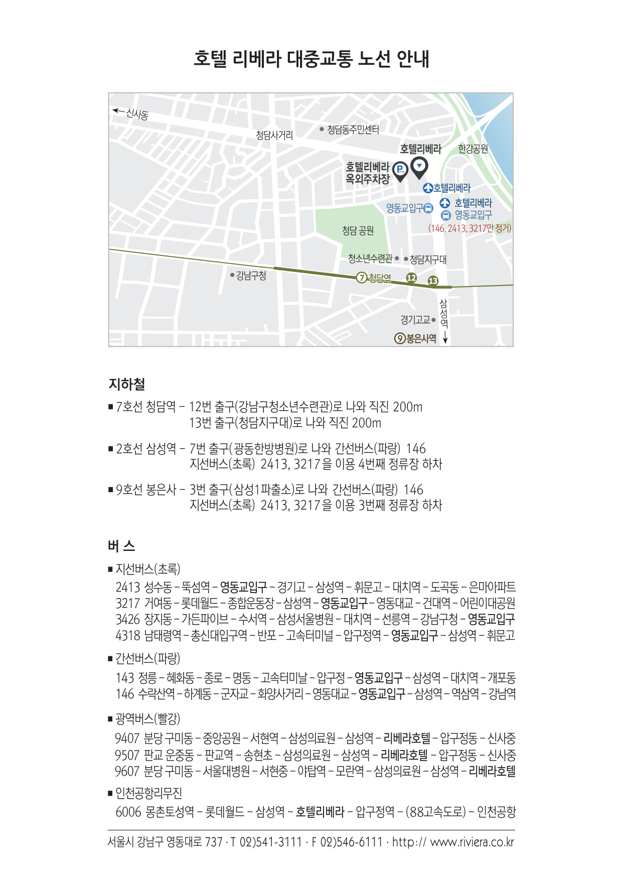 ( http://www.seoulairbus.com ) 인천공항 제2여객터미널 ↔ 인천공항 제1여객터미널 ↔ 호텔리베라 (운행간격: 15~25분, 호텔: 04:10 ~ 20:40, 인천공항: 05:30 ~ 22:41, 소요시간: 70분, 금액: 17,000원) -입국시 : 인천공항 제2여객터미널 정류장(14) → 인천공항 제1여객터미널 정류장(4B) → 호텔 리베라 지하철 9호선 급행 이용시 ( http://www.seoulmetro.co.kr ) 김포공항 ↔ 봉은사역 (운행간격: 7~8분, 소요시간: 37분(급행), 금액: 1,650원) -입국시 : 봉은사역 3번 출구로 나와 지선버스 2413, 3217, 간선버스 146 이용, 3번째 정거장에서 하차 ※ 봉은사역에서 호텔까지 택시 기본요금으로 이용하실 수 있습니다. |